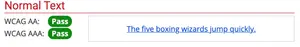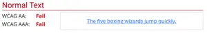 Let’s say we want to create a custom blue text for links. The screenshot below, created using the WebAIM contrast checker, shows an example of a link with poor colour contrast that fails WCAG guidelines. At a minimum, we should aim to conform to WCAG AA standards, with AAA (the highest conformance level) being the ideal target.